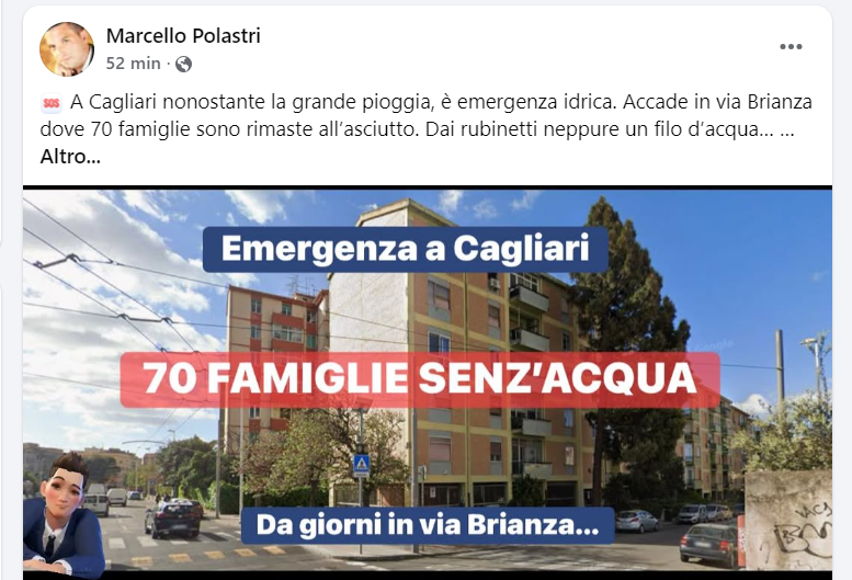CAGLIARI. A Cagliari in via Brianza “settanta famiglie sono senza acqua per cause sconosciute”. A denunciarlo è Marcello Polastri, ex consigliere della commissione sicurezza del Comune di Cagliari, in un post su Facebook. Polastri sostiene di aver contattato chi di competenza, prima telefonicamente poi tramite pec.