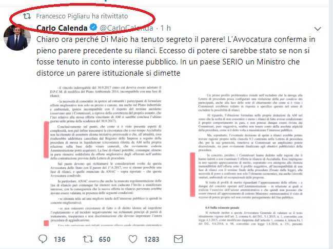 Così è arrivata la sfuriata di Calenda: "Chiaro ora perché Di Maio ha tenuto segreto il parere! L’Avvocatura conferma in pieno parere precedente su rilanci. Eccesso di potere ci sarebbe stato se non si fosse tenuto in conto interesse pubblico. In un paese serio un Ministro che distorce un parere istituzionale si dimette". Una richiesta postata su twitter, che è tata rilanciata anche dal presidente della Regione Sardegna Francesco Pigliaru. E nella repubblica nella quale un ministro degli Interni indagato apre l'avviso di garanzia in diretta Facebook, un retweet vale quanto una dichiarazione ufficiale.