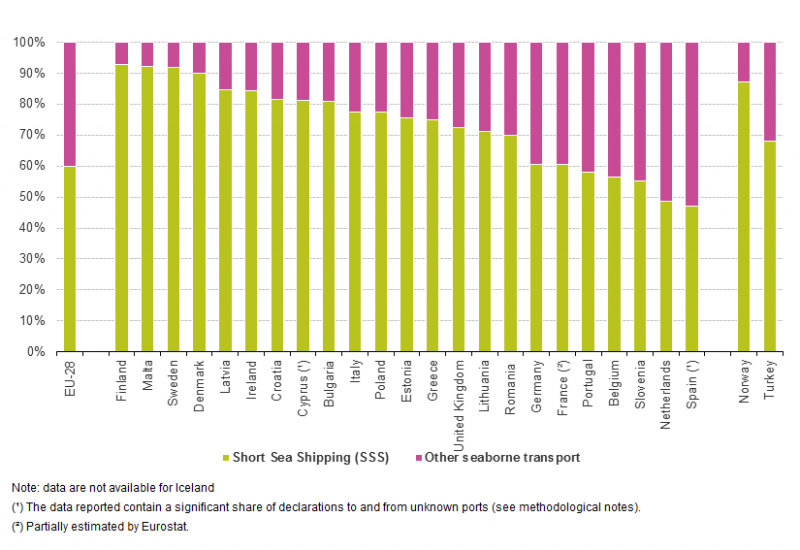 L'incidenza dello Short Sea Shipping sul totale dei trasporti via mare in Europa (Fonte: McKinsey Company)