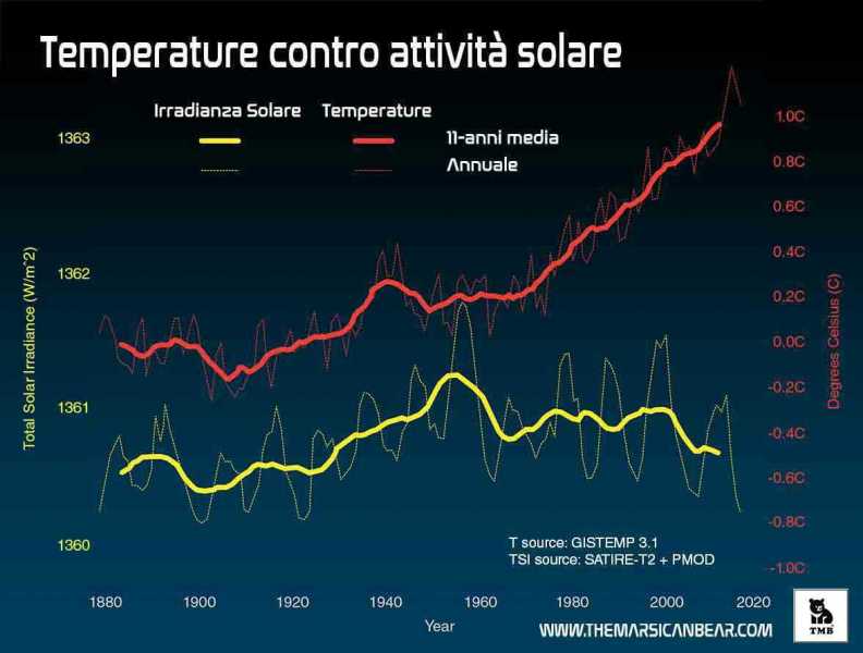 Il direttore sostiene che questa sia la teoria della maggior parte degli scienziati mondiali. Ma ci sono anche esperti che hanno redatto delle tabelle come quella sotto. Che dimostrerebbero, invece, che mentre le temperature salgono costantemente l'attività solare si mantiene costante e, anzi, con il picco del riscaldamento coincide una sua forte riduzione.