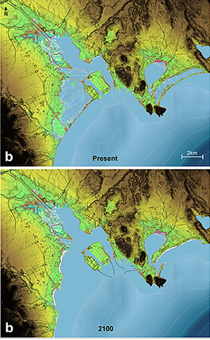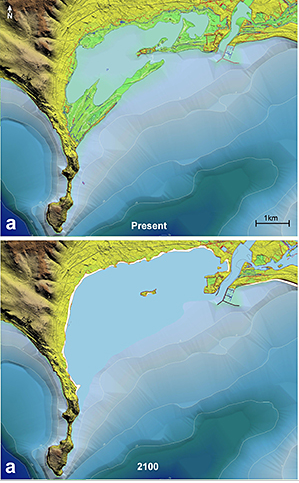Così cambierebbe la geografia costiera di Cagliari secondo i ricercatori coordinati da Fabrizio Antonioli, Research Director al Laboratorio Modellistica Climatica e Impatti dell’Enea.