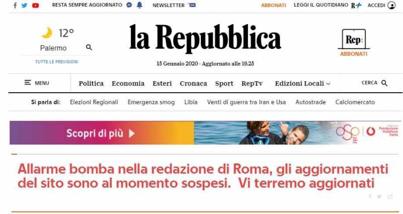ROMA. Allarme bomba nella redazione romana de La Repubblica, la redazione è stata evacuata. La comunicazione è stata pubblicata sul sito del quotidiano, nel quale si avverte della sospensione della pubblicazione degli aggiornamenti".