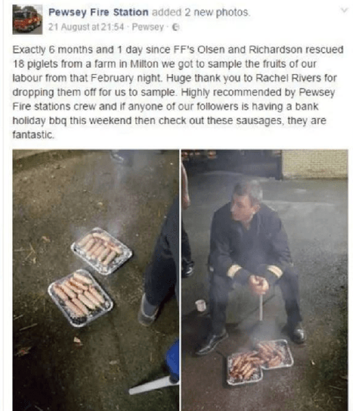 I fatti risalgono ormai a sei mesi fa, ma sono venuti alla luce soltanto negli ultimi giorni proprio a causa del post incriminato. Ma cosa è successo? Procediamo con ordine. Era il mese di febbraio quando - grazie al pronto intervento dei vigili del fuoco di Pewsey - dall'incendio che stava mandando in fumo 60 tonnellate di fieno in una fattoria erano riusciti a salvarsi 18 maialini. Dopo sei mesi, per ringraziare gli eroici pompieri del bel gesto, la proprietaria della fattoria, Rachel Rivers, ha deciso di invitarli a un barbecue in casa. Menù della serata: salsiccia di maialino. Non maialino qualsiasi, ma proprio quei 18 esemplari salvati dal rogo.