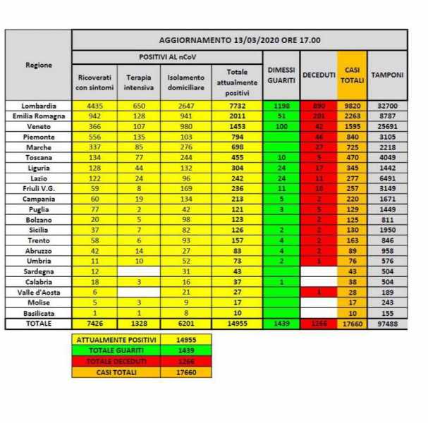 ROMA. Sono 14.955 i contagiati da coronavirus in Italia, 2116 più di ieri. Le vittime salgono a 1266. Ma bisogna sempre specificare che se tutte le vittime avevano il covid-19 non è detto che tutti i decessi siano stati causati dall'infezione. Aumentano considerevolmente anche i guariti, che arrivano a quota 1439. Sono i dati della protezione civile nazionale,
