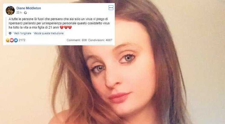 LONDRA. Una ragazza di 21 anni senza patologie pregresse è morta a causa del coronavirus: il suo nome era Chloe Middleton, è finora la vittima più giovane del Regno Unito. Sua madre Diane Middleton ha pubblicato un post straziante. Scrivendo su Facebook, la signora Middleton, che vive nel Buckinghamshire, ha dichiarato: "A tutte le persone là fuori che pensano che sia solo un virus, per favore ripensateci. Parlo per esperienza personale, questo cosiddetto virus ha tolto la vita a mia figlia di 21 anni".