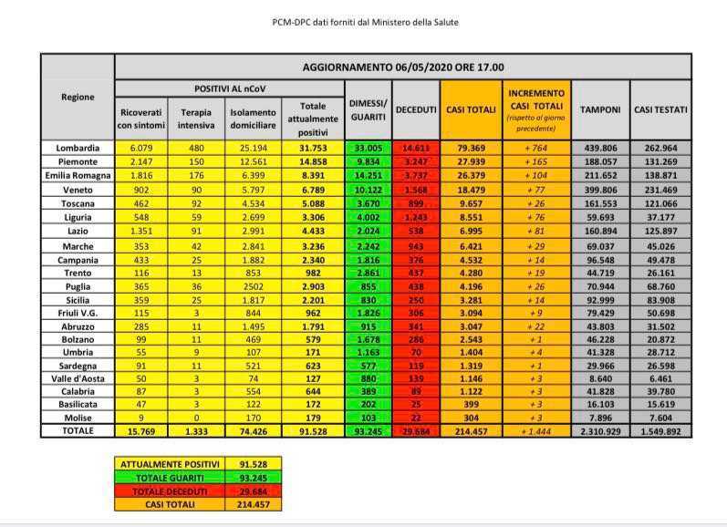 ROMA. In Italia si registrano 1401 nuovi casi di coronavirus. Oltre la metà (720) nella sola Lombardia. Il dato è emerso dall'analisi su 70.359 tamponi nell'arco delle 24 ore. Quindi ancora una volta si registra un caso di positività ogni 50 test. Le vittime nello stesso arco di tempo aumentano di 274, con il conto totale dei decessi legati al Covid che sfiiora i 30mila: 29.958. Sono invece 3.031 i nuovi guariti. Gli attualmente positivi sul territorio nazionale scendono quindi a 89.624