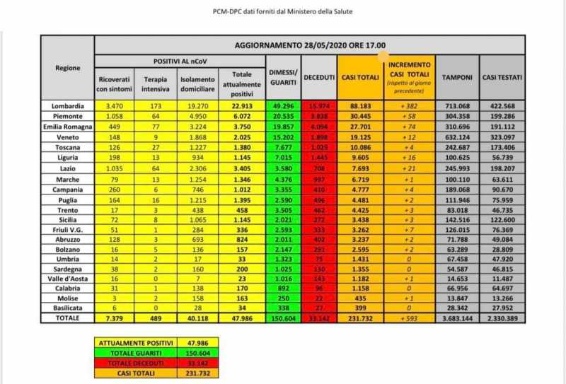 ROMA. Sono 593 i nuovi casi di positività da coronavirus rilevati in Italia nelle ultime 24 ore secondo le tabelle della protezione civile nazionale. I casi salgono a 231.732. Dei nuovi contagi, 382 sono in Lombardia. Le nuove vittime, stando all'aggiornamento, sono 70. Numeri che secondo il governatore lombardo Attilio Fontana, sono confortanti. "Sono convinto che dal 3 giugno i lombardi saranno liberi di circolare in tutta Italia", ha detto il presidente leghista, "tutti i dati sono positivi e in miglioramento".