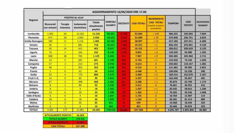 Coronavirus, in Italia 210 nuovi contagi: in Sardegna solo 33 attualmente positivi