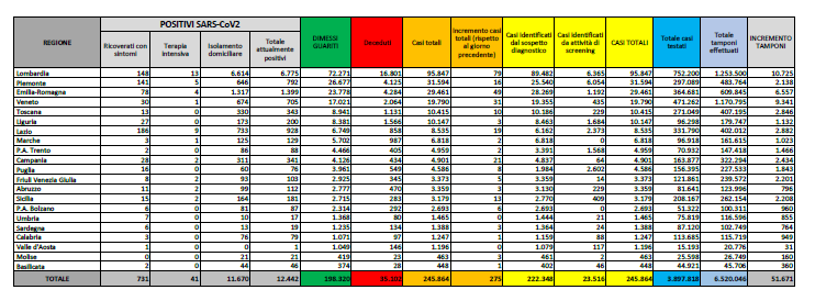 Sono 128 i guariti e 5 le persone morte nelle ultime 24 ore. Per il secondo giorno consecutivo, nessun decesso in Lombardia.
