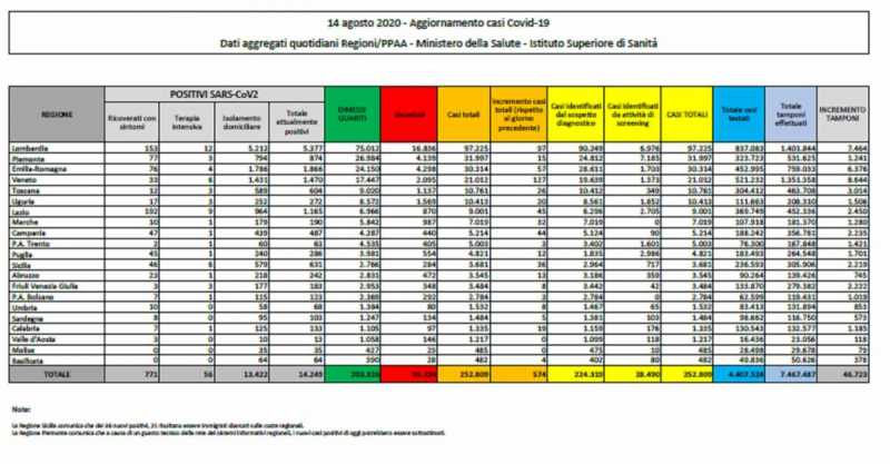 ROMA. Sono 574 i nuovi casi registrati in Italia nelle ultime 24 ore, in aumento rispetto ai 523 di ieri, a fronte di oltre 46mila tamponi effettuati. La Regione Piemonte comunica che per un problema tecnico i nuovi positivi potrebbero essere sottostimati (15 quelli indicati in tabella). Mentre, in Sicilia, dei 36 nuovi positivi 21 risultano essere immigrati sbarcati nell'isola.