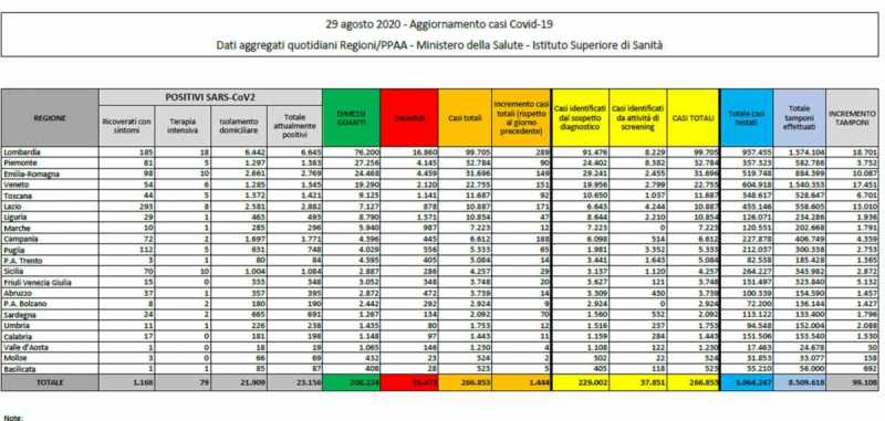 ROMA. Contagi in lieve calo, rispetto al bollettino della protezione civile di ieri, nonostante il record di tamponi effettuati nell'arco delle 24 ore: le nuove positività riscontrate sul territorio nazionale sono state 1444 a fronte di 99.108 test eseguiti. Cresce, purtroppo,il numero dei ricoverati in terapia intensiva: sono 79, cinque in più in una sola giornata. Mentre 10 pazienti sono usciti dall'ospedale: attualmente i ricoverati con sintomi sono 1.168.