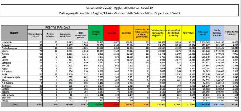 La Lombardia è la Regione che ha registrato il maggior numero di nuovi casi (228), a cui segue il dato della Campania con 193.