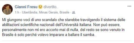 UBERLANDIA. "Non può essere, non mi ero mai accordo di nulla. Del resto se sono venuto in Brasile è solo perché volevo imparare a ballare il samba". Ironico, amaro e tagliente il commento del cagliaritano Gianni Fresu, titolare dal febbraio 2016 della cattedra di Filosofia politica alla Universidade Federal de Uberlandia, in Brasile.