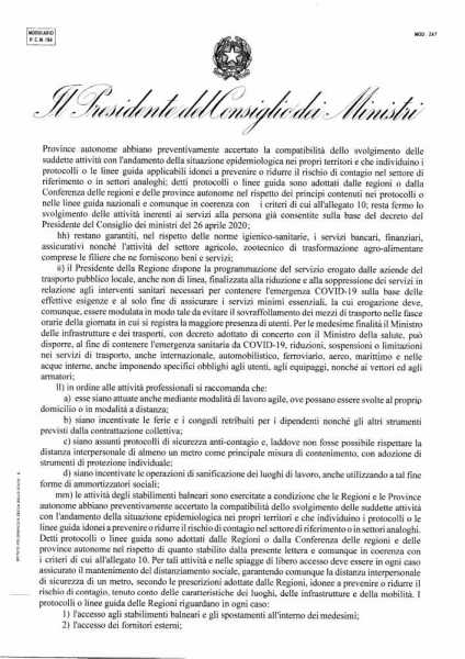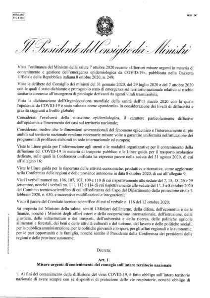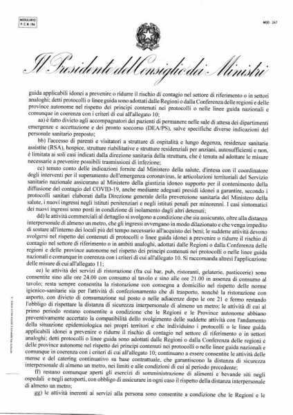 ROMA. Dalla “forte raccomandazione” a evitare feste e inviti a casa con più di sei persone alla chiusura di bar, ristoranti e pub alle 24. Sono alcune delle nuove regole contenute nel Dpcm firmato stanotte dal premier Giuseppe Conte e dal ministro della Salute Roberto Speranza per arginare la nuova ondata di contagi da coronavirus. Le principali novità, in vigore da domani 14 ottobre fino al 13 novembre, riguardano le feste private e la movida, quei momenti in cui troppo spesso cala l'attenzione e, soprattutto con amici e parenti, si abbandonano le regole del distanziamento e delle mascherine. Come accade anche alle cerimonie, che saranno ancora consentite ma con un numero di partecipanti più basso: 30 invitati al massimo. Ad essere sacrificati, però, sono ancora una volta pub e locali: tutte le attività dei servizi di ristorazione dovranno chiudere obbligatoriamente alle 24 per il consumo al tavolo e alle 21 per la consumazione sul posto o nelle adiacenze del locale. Ecco il testo integrale del nuovo Dpcm: