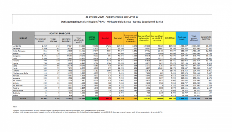 MILANO. Meno tamponi, come ogni lunedì, e meno contagi registrati. Nelle ultime 24 ore in Italia sono stati accertati 17.012 nuovi casi di coronavirus, ieri erano più di 20mila ma con 37mila tamponi effettuati in meno di ieri. Aumentano le vittime, oggi 141 e i ricoveri in terapia intensiva sono 1284 (76 più di ieri). Quasi mille gli altri pazienti ricoverati nello stesso arco di tempo.