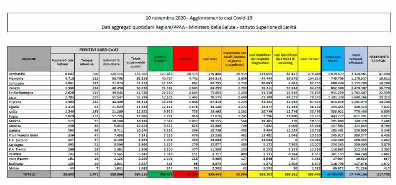 ROMA. I nuovi contagi sono 35.908, i morti 580 (con l'Abruzzo che segnala di aver inserito oggi 21 decessi delle ultime tre settimane) e i guariti 17.734. Ecco i numeri del contagio in Italia aggiornati al 10 novembre. I posti letto occupati in terapia intensiva sono 122 in più, mentre i nuovi ricoveri non gravi salgono di 997.