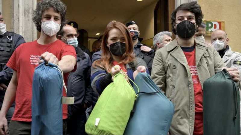 Una ventina di esponenti del movimento, guidati da Mattia Santori e Jasmine Cristallo, ha manifestato con tende e sacchi a pelo, oggi pomeriggio sotto la sede del Partito Democratico in via del Nazareno a Roma.