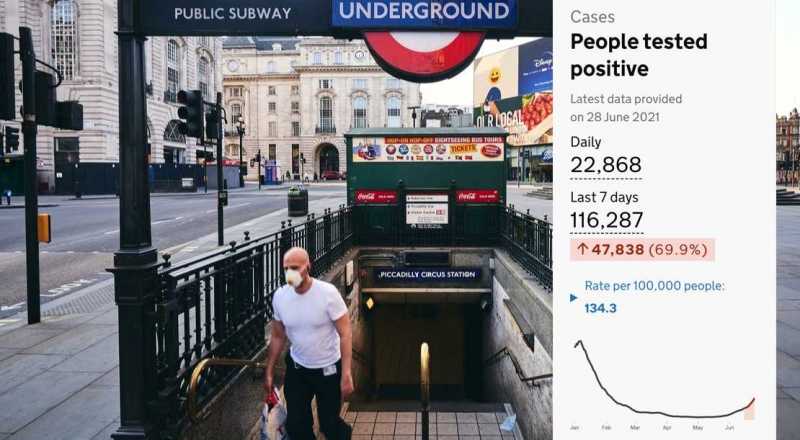 LONDRA. Nuovo record di contagi in Gran Bretagna. Oggi sono stati accertati 22.868 casi di Covid e la variante Delta fa sempre più paura. Secondo i dati, negli ultimi 7 giorni c'è stato un aumento di positivi del 69,9%. E infatti dai grafici emerge che la curva epidemiologica sta salendo. Negli ultimi 7 giorni ci sono stati 1557 ricoveri in ospedale, ma la buona notizia è che il numero dei morti non è salito in picchiata: oggi 3 i nuovi decessi.