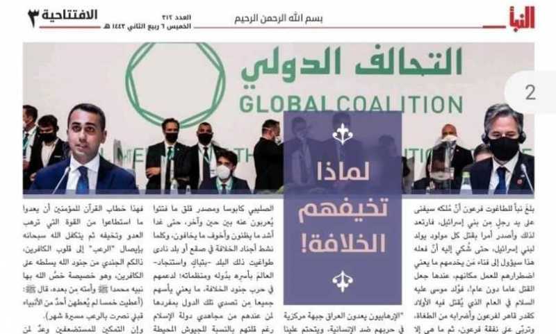 La rivista Al Naba ha pubblicato una foto di Di Maio in occasione del vertice della coalizione anti-Daesh del giugno scorso insieme al segretario di Stato Usa Blinken.