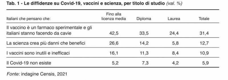 ROMA. La maggioranza degli italiani "è ragionevole e saggia", ma il Covid ha fatto emergere una fetta di popolazione che coltiva “un’onda di irrazionalità”. Quale? Questa: per il 5,9% degli italiani (circa 3 milioni di persone) il Covid semplicemente non esiste, per il 10,9% il vaccino è inutile e inefficace. Mentre per il 31,4% è un farmaco sperimentale e le persone che si vaccinano fanno da cavie. Per il 12,7% la scienza produce più danni che benefici.