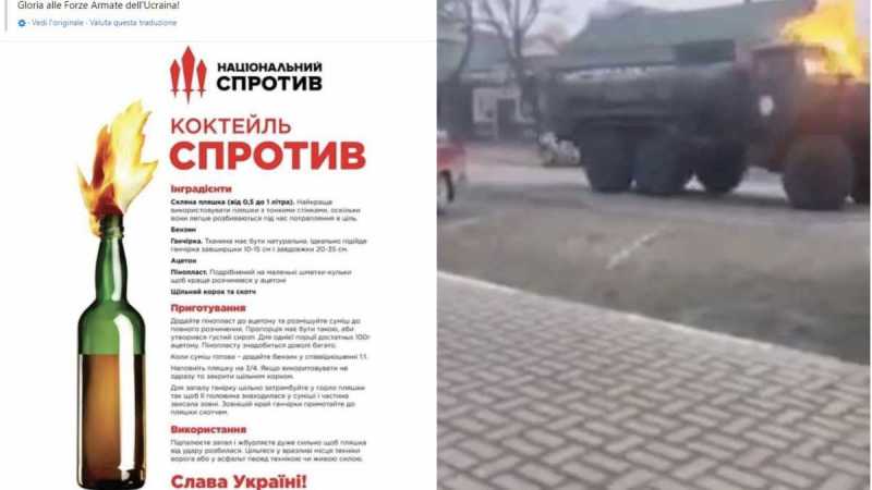 KIEV. Il governo ucraino invita i cittadini a realizzare delle bombe molotov da usare contro i nemici russi. Ma come si preparano? Lo spiega alla popolazione, con una locandina, la pagina che si occupa della comunicazione delle forze armate ucraine. Ecco il post.