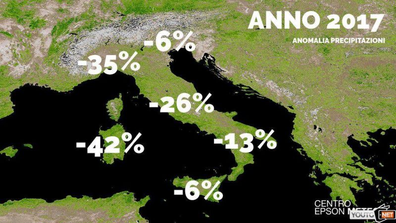 A fare i conti è il Centro Epson meteo: "In 12 mesi – spiega il meteorologo Simone Abelli - sono mancati all’appello circa 40 miliardi di metri cubi d’acqua, otto volte l’acqua contenuta nel Lago di Bracciano. I deficit più pesanti si riscontrano soprattutto sui settori occidentali del Paese: al Nord-Ovest l’anno si è chiuso con il -35% della pioggia, al Centro con il -26%, al Sud con il -13%, ma è in Sardegna l’anomalia peggiore, con un deficit del -42%". A pesare sul bilancio è stata la carenza di piogge della prima parte dell'anno in inverno, primavera, estate, e poi ottobre. E non sono bastati settembre e novembre che hanno fatto registrare un timido recupero.