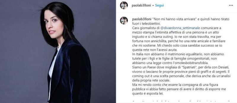 "Non mi hanno vista arrivare e quindi hanno tirato fuori i teleobiettivi". Inizia così il lungo post su Instagram con cui la 28enne critica il comportamento della stampa: "Comunicare a mezzo stampa l’intimità affettiva di una persona è un atto ingiusto e si chiama outing. Io ne son stata travolta, ma per fortuna non annichilita, perché ho una rete amicale e familiare che mi sostiene. Mi chiedo solo - prosegue - cosa sarebbe successo se io questa rete non l’avessi avuta. In Italia non abbiamo il matrimonio egualitario, non abbiamo tutele per i figli e le figlie di famiglie omogenitoriali, non abbiamo una legge contro l'omolesbobitransfobia. Siamo un Paese dove migliaia di 'Spatriati', per dirla con Desiati, vivono o lasciano le proprie province pieni di graffi e di segreti. Il coming out è una scelta personale, che deriva anche da un'analisi della propria rete sociale. Ma mi rendo conto che essere la compagna di una figura pubblica vi abbia fatto pensare di avere il diritto di esporre me quanto è esposta lei".