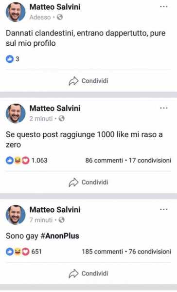 MILANO. "Dannati clandestini, entrano dappertutto, pure sul mio profilo", Oppure: "Se questo post raggiunge mille like mi raso a zero". O ancora: "Sono Gay". Messaggi scritti sulla pagina Facebook di Matteo Salvini, ma l'autore non è il leader della Lega: il profilo è stato colpito dagli Hacker di AnonPlus, gli stessi che si sono introdotti nelle banche dati del Pd nei giorni scorsi. Le frasi pubblicate a nome di Salvini sono state rimosse.