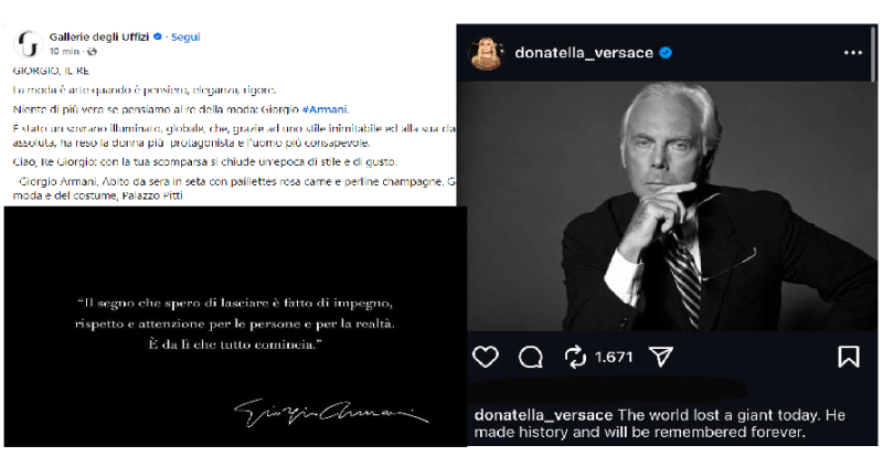 Giorgio Armani, non solo stilista ma artista a tutti gli effetti, viene ricordato anche dalla Galleria degli Uffizi che sottolinea il forte legame tra moda e arte “La moda è arte quando è pensiero, eleganza, rigore. Niente di più vero se pensiamo al re della moda: Giorgio Armani. È stato un sovrano illuminato, globale, che, grazie ad uno stile inimitabile ed alla sua classe assoluta, ha reso la donna più protagonista e l'uomo più consapevole”.