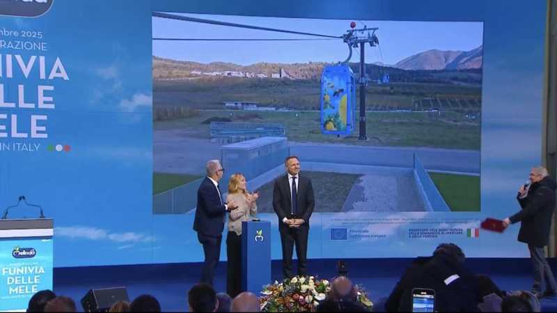 Meloni ha descritto l'opera come "dotata di visione" e "all'avanguardia". Accompagnata dal ministro dell'Agricoltura Francesco Lollobrigida, la premier - insieme al presidente del Consorzio Melinda Ernesto Seppi - ha partecipato alla cerimonia che ha visto l'attivazione della funivia, destinata a collegare le zone di raccolta alle celle ipogee di stoccaggio.