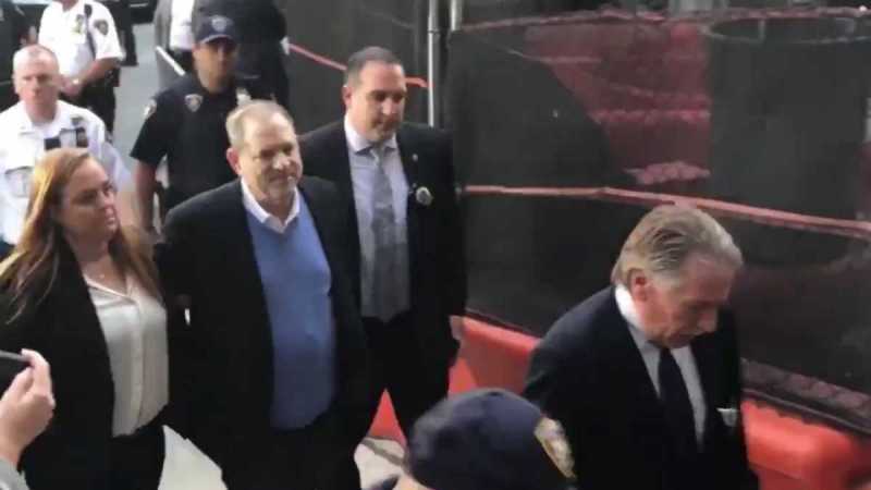 A handcuffed Harvey Weinstein is escorted into a Manhattan court, avoids shouted questions. pic.twitter.com/JT6XXS2kMf