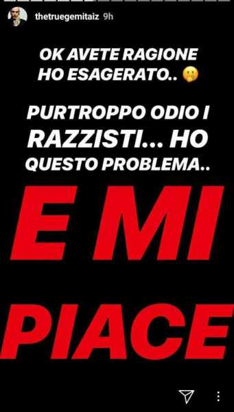 Dopo lo sfogo Gemitaiz ha cancellato il post tornando (solo in parte) sui suoi passi: "Ok, avete ragione ho esagerato - scrive il rapper capitolino in una Instagram story - purtroppo odio i razzisti, ho questo problema, e mi piace".
