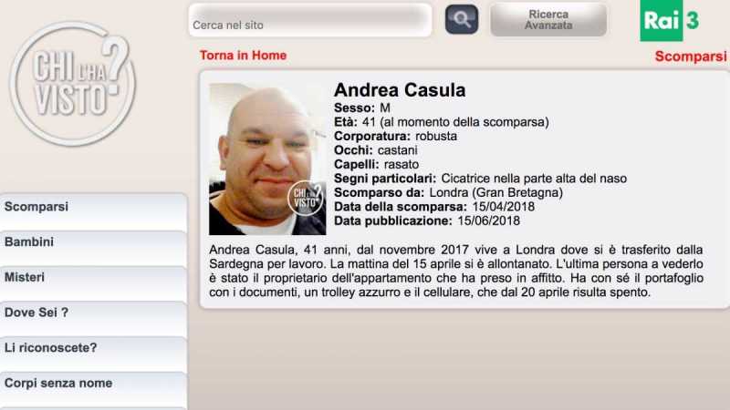 CAGLIARI. Si era trasferito a Londra per lavoro, poco meno di un anno fa. Ma dopo i primi mesi è scomparso nel nulla. Nessuno ha più notizie di Andrea Casula, quarantunenne di Dolianova, dal 15 aprile scorso. L'ultima persona a vederlo è stato il proprietario dell'appartamento che aveva preso in affitto appena prima di sparire. Dal giorno più nulla, e sono passati ormai 4 mesi. La cugina dell'uomo ha fatto appello anche al noto programma Rai "Chi l'ha visto?" per tentare di trovare Andrea, ma finora senza risposte. Così su Facebook, nella pagina a lui dedicata ("Cerchiamo Andrea"), si leggono decine e decine di commenti: dettagli su dettagli della vita dell'uomo per cercare di risalire alla verità.