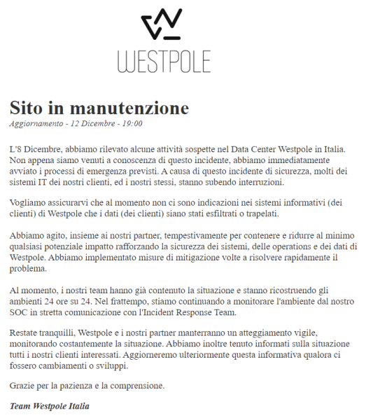 La Westpole ha fornito, seppure in ritardo, una prima comunicazione ufficiale informando gli utenti dell'interruzione dei servizi dovuta a un incidente di sicurezza. E annunciando che,  per il momento, non sembrano esserci prove di furto di dati. Questo dopo che diversi  giorni consecutivi, il suo sito web  è rimasto inaccessibile, mostrando un messaggio che indicava lavori di manutenzione in corso.