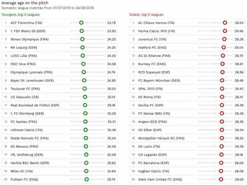 CALCIO. Chievo, Parma e Juventus sono le tre squadre più vecchie dei cinque principali campionati europei: l'età media delle loro rose è rispettivamente 29,53, 29,46 e 29,26 anni. I bianconeri pagano anche, almeno in questa classifica, non certo in quella a punti, l'acquisto del 33enne Cristiano Ronaldo. Nella top 20 c'è anche il Cagliari, al 19esimo posto. Per i rossoblù (i più anziani sono il portiere Rafael e Darijo Srna, anno di nascita 1982) una media 29,08 anni, un centesimo in meno di quella del Barcellona. La squadra più giovane invece è la Fiorentina che sfrutta la freschezza e l'anagrafe di Chiesa (classe 1997) e Lafont (portiere del 1999).