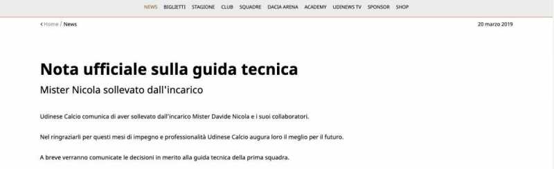 UDINE. L'Udinese ha esonerato l'allenatore Davide Nicola e il suo staff. Lo comunica ufficialmente la stessa società friulana con una nota confermando le voci che circolavano da qualche ora: "Nel ringraziarli per questi mesi di impegno e professionalità Udinese Calcio augura loro il meglio per il futuro. A breve verranno comunicate le decisioni in merito alla guida tecnica della prima squadra". Al posto di Nicola, in panchina potrebbe tornare Igor Tudor. (foto Facebook Udinese Calcio)