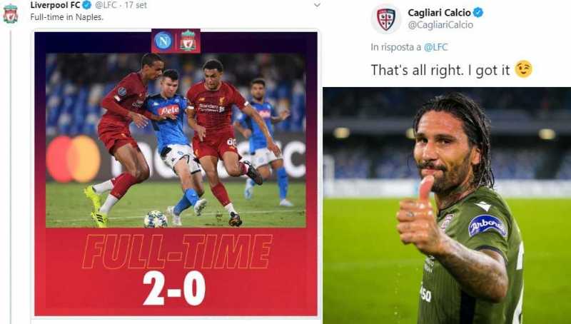 — Liverpool FC (@LFC) September 17, 2019Il Cagliari, quindi, è riuscito dove non ce l'hanno fatta i campioni d'Europa del Liverpool, che il 17 settembre avevano perso 2-0 in Champions proprio contro il Napoli. Il risultato finale di quel match è ancora li, su Twitter, sul profilo ufficiale del club inglese. Ed è lì che arriva la "guasconata". Un tweet di risposta del Cagliari calcio. Che dice: "Va tutto bene, ci ho pensato io".