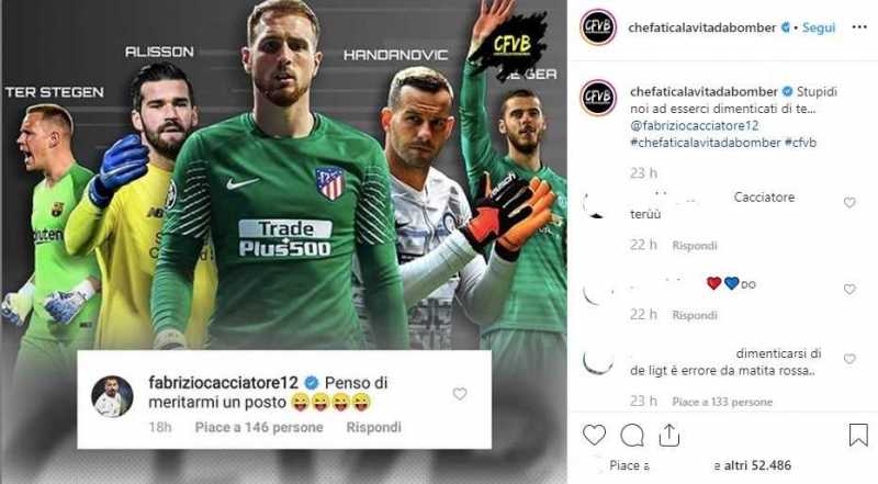 CAGLIARI. Che Fabrizio Cacciatore avesse un talento speciale come portiere l'hanno pensato un po' tutti alla fine di Lecce-Cagliari, quando al minuto 81 il terzino rossoblù si è immolato e ha tentato di parare il tap-in di La Mantia, alzando il braccio sopra la traversa. Quel gesto istintivo, ovviamente, gli è costata l'espulsione diretta, ma la rabbia, a distanza di qualche settimana, si è trasformata in ironia anche per il giocatore. Il siparietto va in scena sulla pagina Instagram del noto profilo "Che fatica la vita da bomber", dove Cacciatore ha commentato un post in cui si chiedeva agli utenti quale fosse il migliore portiere tra Ter Stegen, Alisson, Oblak, Handanovic e De Gea. Il numero 12 del Cagliari così ha colto la palla al balzo: "Penso di meritarmi un posto". E la pagina risponde con la stessa ironia: "Stupidi noi ad esserci dimenticati di te".