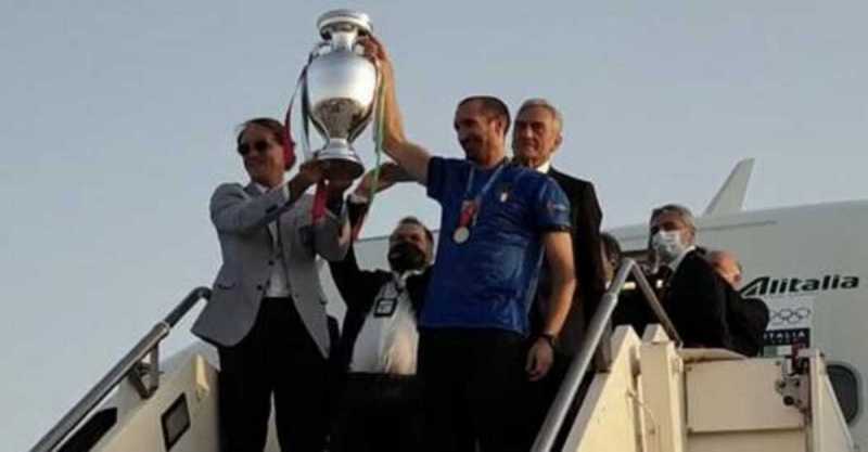 Cori e applausi quando Mancini e Chiellini sono apparsi in cima alle scalette dell'aereo, alzando la Coppa che torna in Italia dopo 53 anni. È stato il tributo dalle decine di operatori aeroportuali che si sono radunati sotto il velivolo per festeggiare i campioni. "Grazie azzurri", recitava uno striscione.