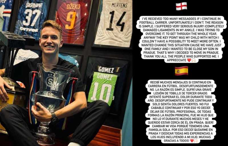"Ho ricevuto tanti messaggi per sapere se la mia carriera calcistica continuerà. Purtroppo la risposta è no. Il motivo è semplice: ho subito un infortunio molto grave (legamento della caviglia completamente leso). Stavo cercando di superarlo per affrontare la stagione”, scrive così sui social il centrocampista ceco.