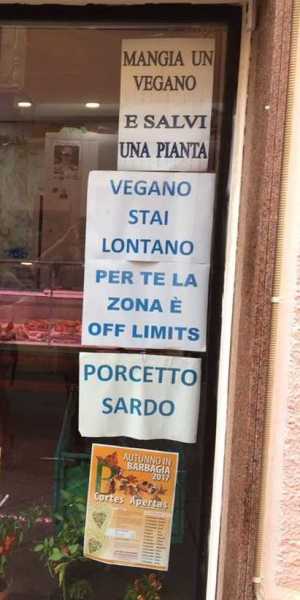 LA MADDALENA. "Mangia un vegano e salvi una pianta". "Vegano stai lontano, per te la zona off limits". Sono i testi di alcuni cartelli che compaiono sulle vetrate della macelleria di La Maddalena gestita da Giancarlo Maurelli. Sono lì da anni, da quando il macellaio aveva patito un'incursione animalista che criticava la sua attività. Ma oggi sono tornati alla ribalta, attraverso il solito meccanismo di condivisioni del web.