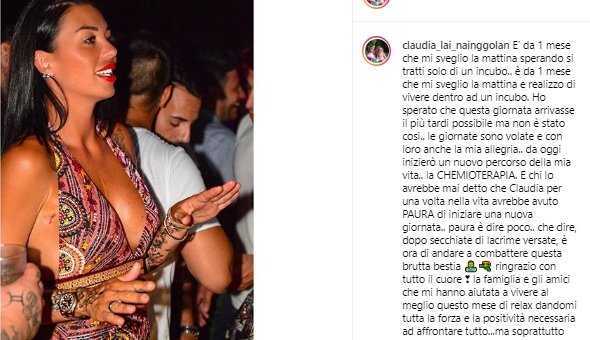 CAGLIARI. Claudia Lai, moglie del ninja Radja Nainggolan, combatte contro un tumore. A rivelarlo è lei stessa, con un post su Instagram, che dimostra sì timore, ma anche grinta e voglia di vivere: "È da un mese che mi sveglio la mattina sperando si tratti solo di un incubo. È da un mese che mi sveglio la mattina e realizzo di vivere dentro ad un incubo. Ho sperato che questa giornata arrivasse il più tardi possibile ma non è stato cosi. Le giornate sono volate e con loro anche la mia allegria: da oggi inizierò un nuovo percorso della mia vita, la chiemioterapia. E chi lo avrebbe mai detto che Claudia per una volta nella vita avrebbe avuto paura di iniziare una nuova giornata? Paura è dire poco: che dire, dopo secchiate di lacrime versate, è ora di andare a combattere questa brutta bestia. Ringrazio con tutto il cuore la famiglia e gli amici che mi hanno aiutata a vivere al meglio questo mese di relax dandomi tutta la forza e la positività necessaria ad affrontare tutto. Ma soprattutto hanno saputo gestire ogni mio malumore (con un alto livello di sopportazione). In bocca al lupo a me e a tutte le persone che stanno vivendo il mio stesso incubo".