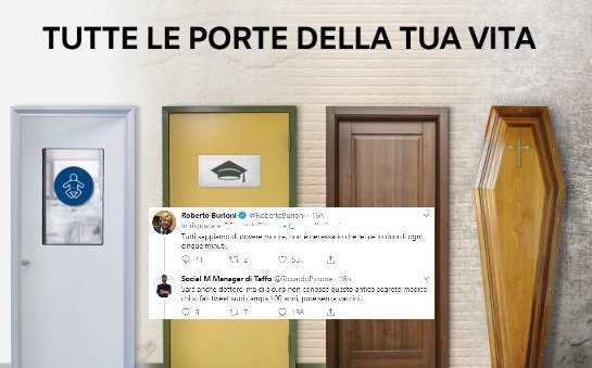 Abbiamo contattato le + importanti cliniche e università di Roma, ma nessuno ha accettato, tranne Taffo e Messere che gestiamo noi. Per fare social ci vuole coraggio. pic.twitter.com/FiBfOTmVxBPirroni svela che la società per la quale lavora aveva proposto una campagna di marketing comune a quattro enti e società. "Le quattro porte della tua vita". C'è quella di una clinica, dove si nasce, di un'università, dove si studia, una porta normale - di una fabbrica di porte, appunto - e quella di una bara. Di Taffo, ovviamente. Ma la proposta non è andata in porto.