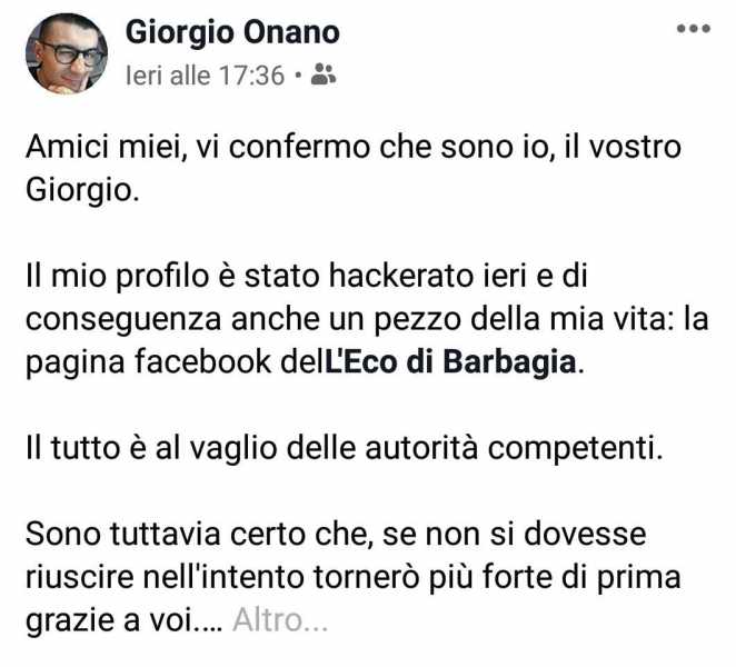 CAGLIARI. "Cari amici, sono io: il mio profilo è stato hackerato e di conseguenza anche un pezzo della mia vita, la pagina Facebook de L'Eco di Barbagia". Così scrive Ignazio Onano, l'admin della seguitissima pagina con oltre 200mila follower che tratta di "cose di Sardegna".