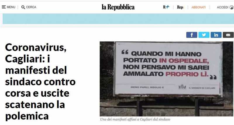 CAGLIARI. La notizia dei cartelli choc a Cagliari firmati dal sindaco Paolo Truzzu ha fatto scalpore (leggi qui). E mentre il primo cittadino ha già spiegato la sua posizione (leggi qua la sua dichiarazione), la storia è arrivata alla redazione di Repubblica. L'articolo è online con tanto di foto in allegato. Peccato che l'immagine non sia quella originale, ma una versione modificata da qualche utente. Un meme, insomma.