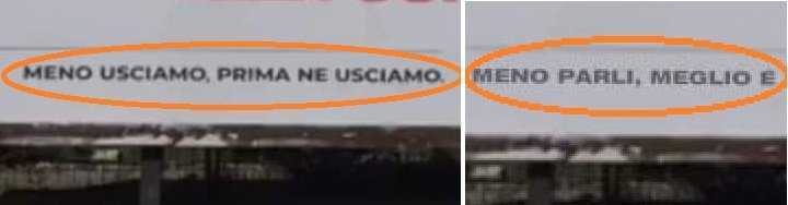 In basso a sinistra, invece dello slogan "Meno usciamo, prima ne usciamo", compare "Meno parli, meglio è". Un messaggio totalmente differente.