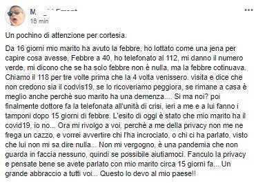 "Da 16 giorni", racconta, mio marito ha avuto la febbre, anche a 40. Ho lottato come una jena per capire cosa avesse. Ho telefonato al 112, mi danno il numero verde, mi dicono che se ha solo febbre non è nulla, ma la febbre continuava. Chiamo il 118 per tre volte prima che dopo la quarta venissero. Lo hanno visitato e hanno detto che non credevano fosse coronavirus. "Se lo ricoveriamo peggiora, se rimane a casa è meglio anche perchè suo marito ha una demenza", le hanno detto. "Si ma noi?", continua la donna, "poi finalmente il dottore fa la telefonata all'unità di crisi, ieri a me e a lui fanno i tamponi. Dopo 15 giorni di febbre. L'esito di oggi è stato che mio marito ha il covid19, io no". E si rivolge al paese: "perché a me della privacy non me ne frega un cazzo, e vorrei avvertire chi l'ha incrociato, o chi ci ha parlato, visto che lui non mi sa dire nulla. Non mi vergogno, è una pandemia che non guarda in faccia nessuno, quindi se possibile aiutiamoci. Fanculo la privacy e pensate bene se avete parlato con mio marito circa 15 giorni fa. Un grande abbraccio a tutti voi. Questo lo devo al mio paese".