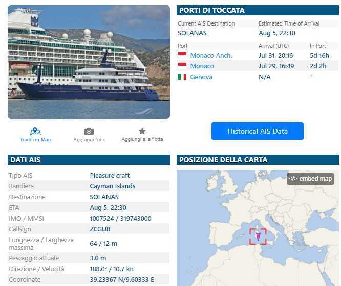 È molto probabile che a bordo ci sia anche mister Billiionaire. Il tracciato del transponder dello scafo battente bandiera della Cayman indica che l'ultimo porto di approdo è stato quello del principato di Monaco. A Montecarlo, proprio ieri, Briatore ha inaugurato un suo Crazy Pizza: su Instagram ha pubblicato il video della benedizione del locale.