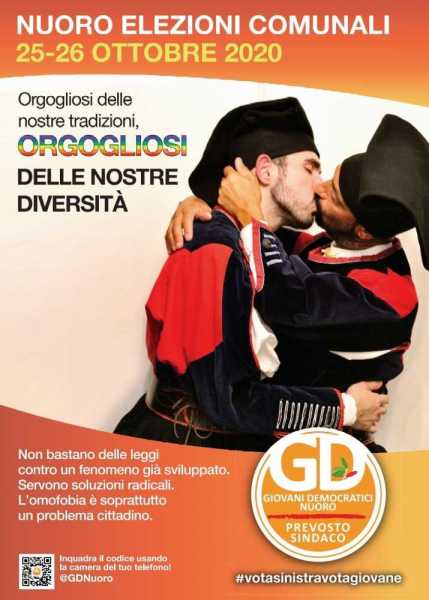 NUORO. Due giovani in abito tradizionale che si baciano, entrambi maschi. Compaiono sul volantino elettorale dei Giovani democratici di Nuoro, che sostengono la candidatura di Carlo Prevosto, uscito vincente dalle primarie del centrosinistra per la conquista del municipio del capoluogo barbaricino.