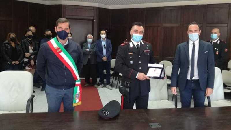 IGLESIAS. Una targa di encomio per l'appuntato dei Carabinieri Damiano Muffaldi che la scorsa settimana, mente era fuori servizio, ha soccorso una giovane donna salvandola da un tentativo di suicidio (QUI LA NOTIZIA). Questa mattina, la cerimonia di consegna da parte del sindaco Mauro Usai e del presidente del Consiglio comunale Daniele Reginali.